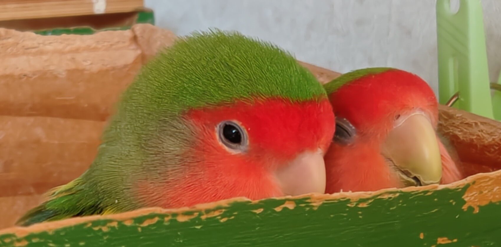 小箱で寝るみどみど組の二羽。
